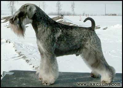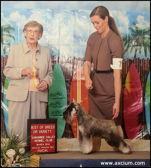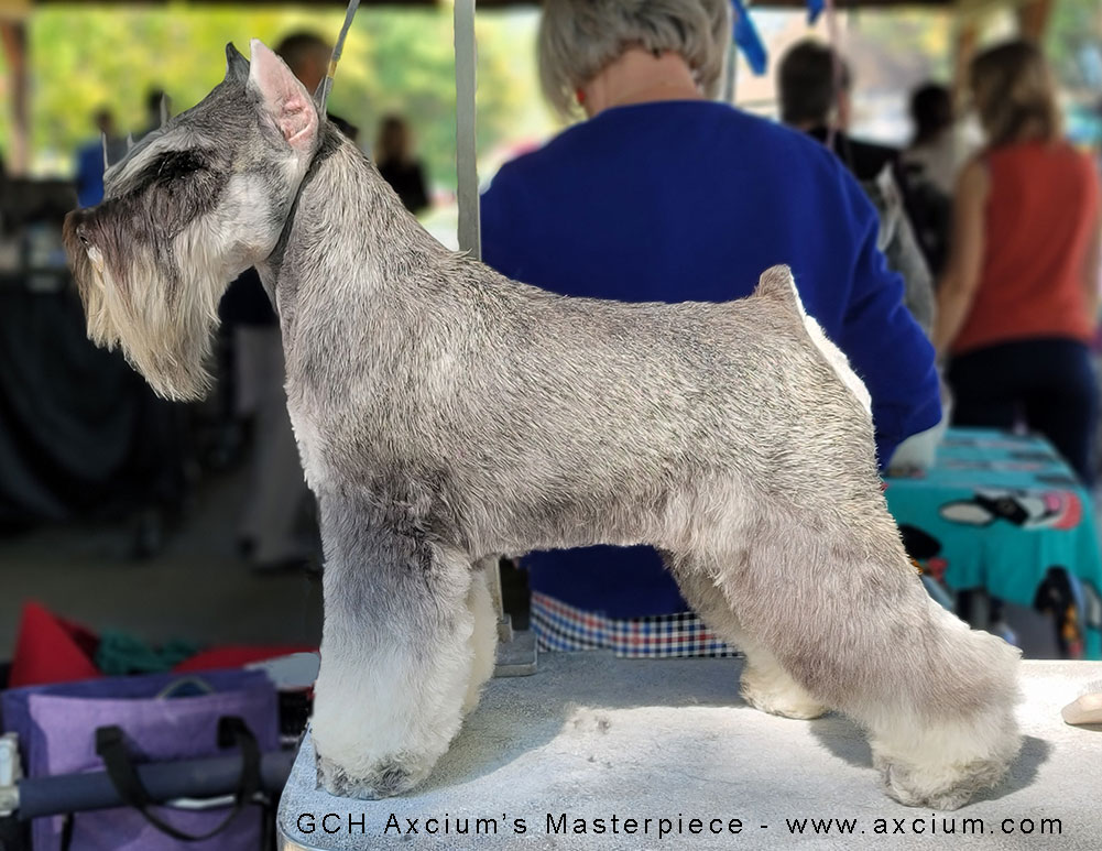 Ricco had a lovely head, hard clear salt and pepper coat, great movement and a happy outgoing personality. Co-owned with Rochelle Wolfe. Ricco is the first champion for his dam Ch Axcium’s Third Time’s A Charm and the 4th champion for his sire Ch Auximum Federico Fellini for Axcium.
