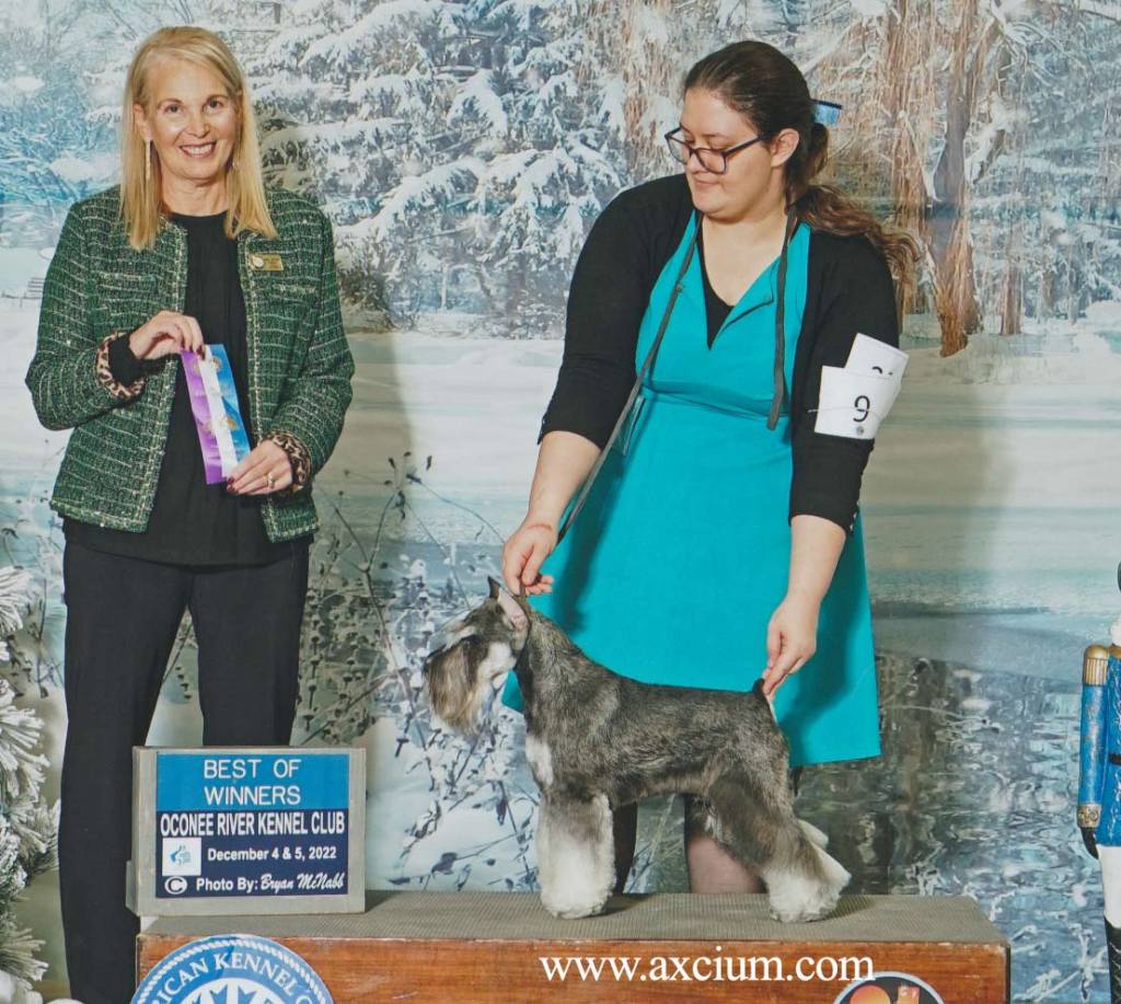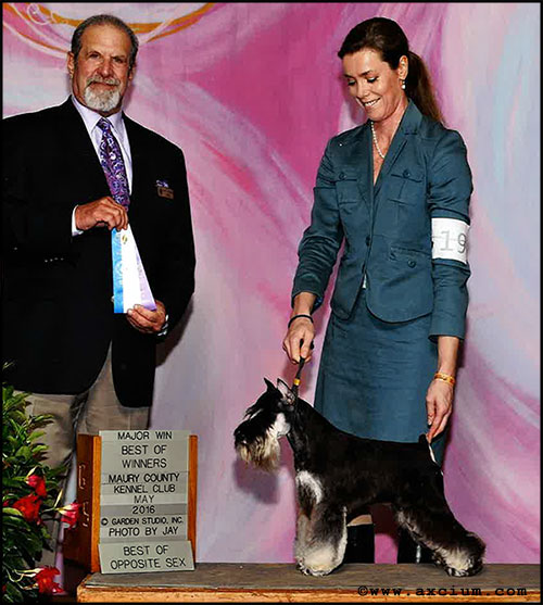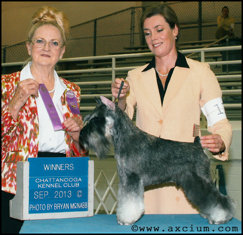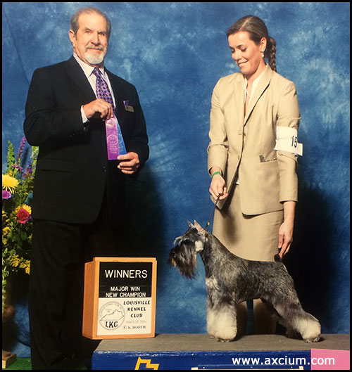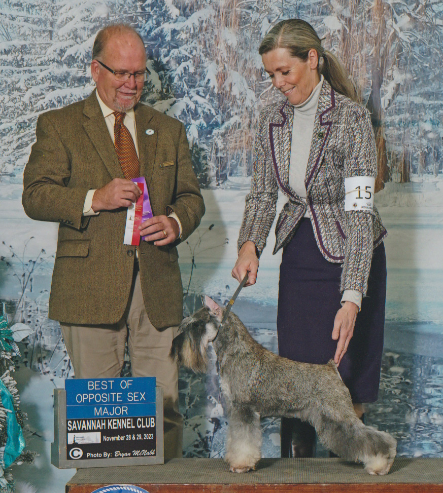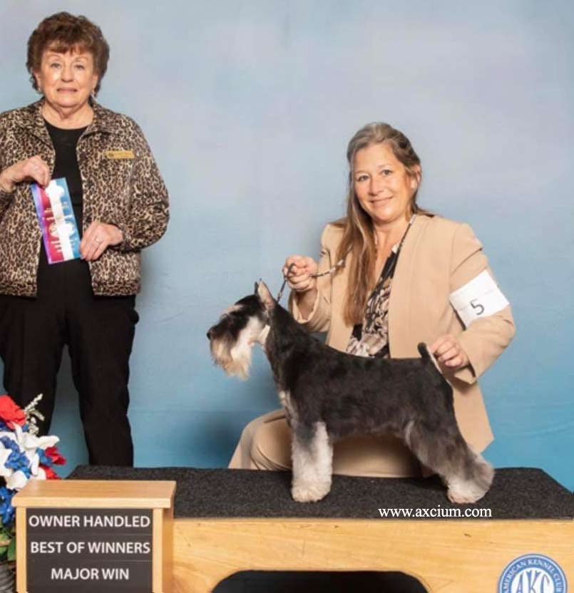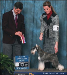 Sumo finished quickly in 4 weekends. He has an exquisite head, short back, and ultra-hard clear salt and pepper coat. Sumo is the first champion for his mother Ch Axcium’s Smartass Sassypants, and he is co-owned with Janna DeBey.