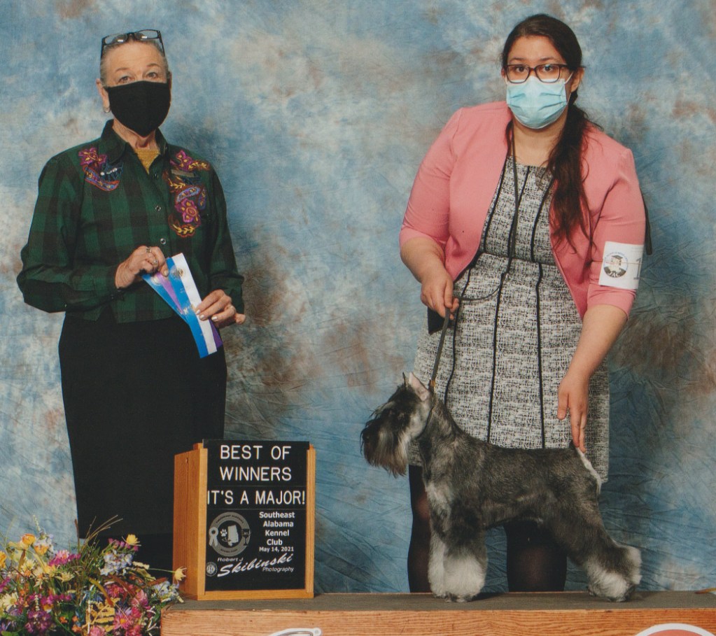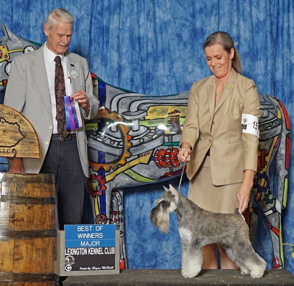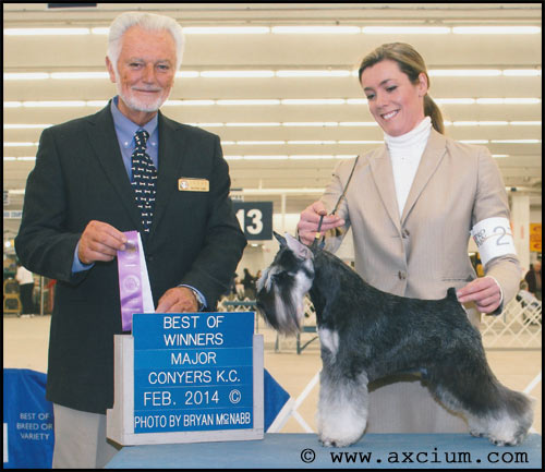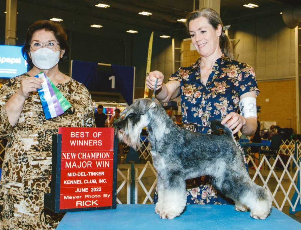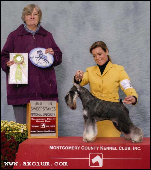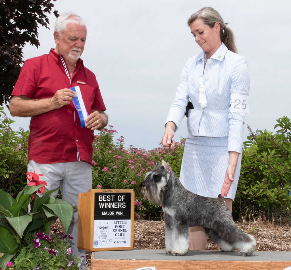 Sumo finished quickly in 4 weekends. He has an exquisite head, short back, and ultra-hard clear salt and pepper coat. Sumo is the first champion for his mother Ch Axcium’s Smartass Sassypants, and he is co-owned with Janna DeBey.