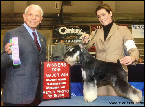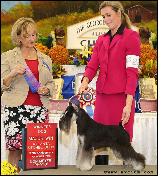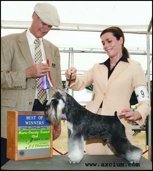 Striker finished both championships on one coat with only majors, he won Reserve at the main show of the year Montgomery, and he beat the number one miniature schnauzer in the country twice – all before the age of 1!!! Striker has an outstanding headpiece, a striking outline, great reach and drive, wonderful size, tailset and bone. He is the first champion for his dam GCH Axcium’s Star Witness. Co-owned with Robin Gatti Newbern.