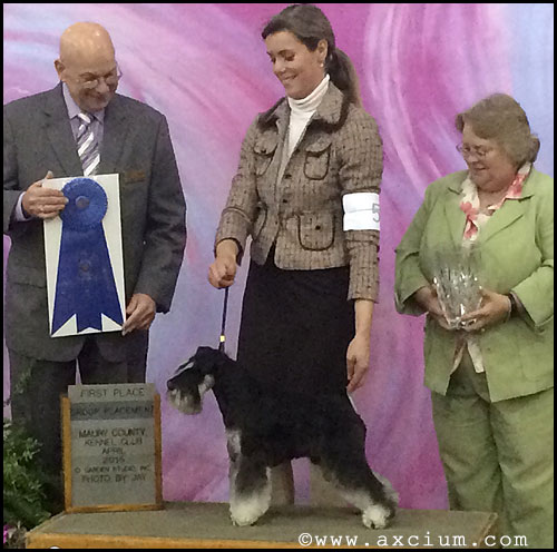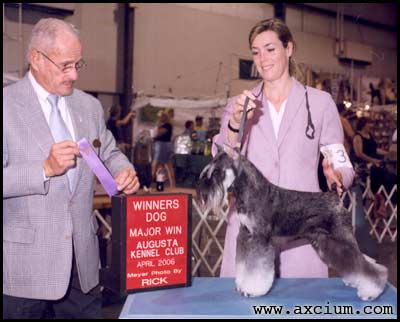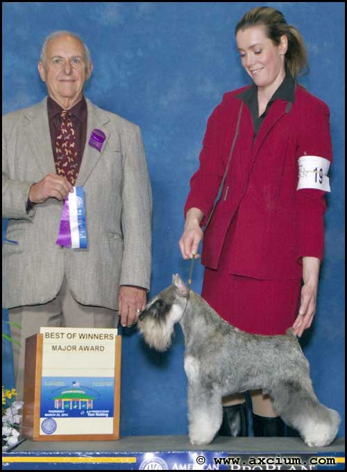 Deogee finished his Grand Championship thanks to co-owners Carl & Carol Benson in 2011. He finished easily with 4 majors in April 2007. He had a great debut as a 7 month old and is pictured with his first major above. A big THANK YOU to Bill Brown (Gangway Miniature Schnauzers) for putting the last major on Deogee, and to Carol and Carl Benson in Texas for providing a super home. ( – and for all of you who ask me about his name: it’s D-O-G!).