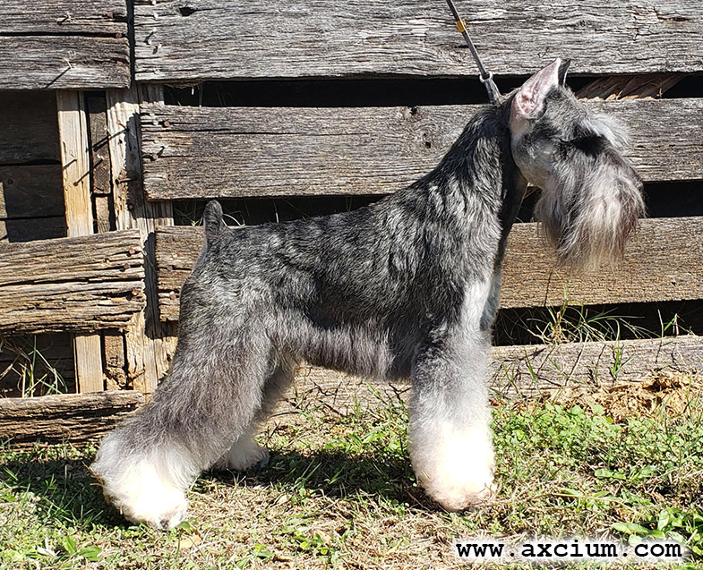 Sire has accumulated an impressive number of titles in Europe. He is enjoying life in Italy with Rossana & Francesco Stanislao (Auximum Miniature Schnauzers). Sire is the 3rd champion for his dam Ch Axcium’s and the 3rd champiopn for his sire GCHB Axcium’s Only The Brave.