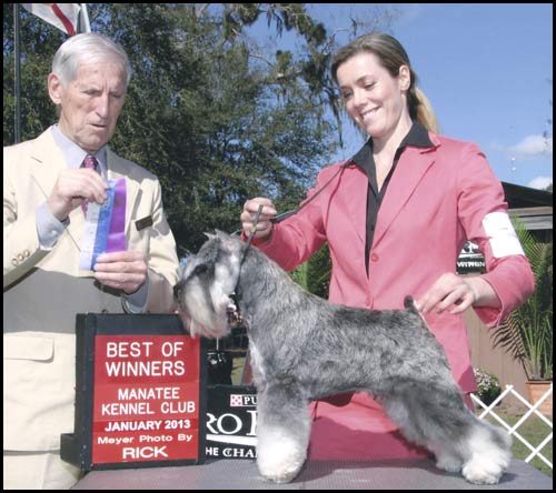 Riley had a remarkable start on his show career. On his first weekend out he went breed from the classes all 4 days and proceeded to get two Group 4 placements. He also won reserve at the prestigious Hatboro show. He finished his championship with limited showing in two months only 1 year old, going Breed from the classes over 4 specials including the number 1 miniature schnauzer in the US. Fabulous mover from all directions, striking outline and lovely temperament. This 13.5 inch tall black and silver carrier has drawn a lot of favourable attention.