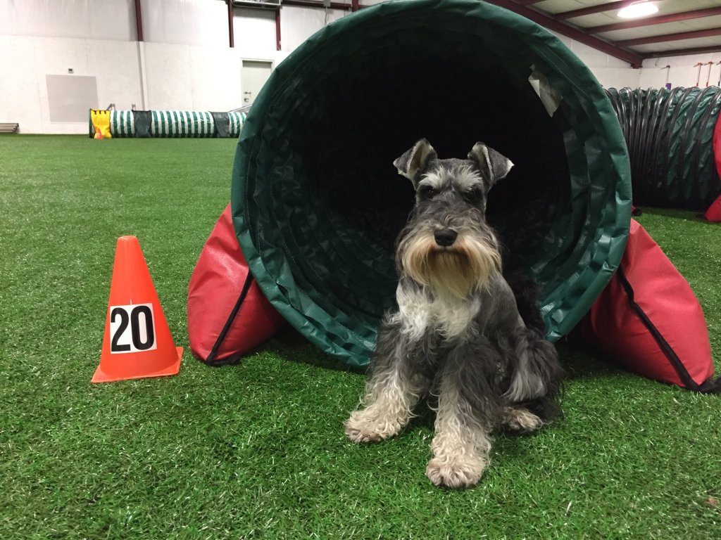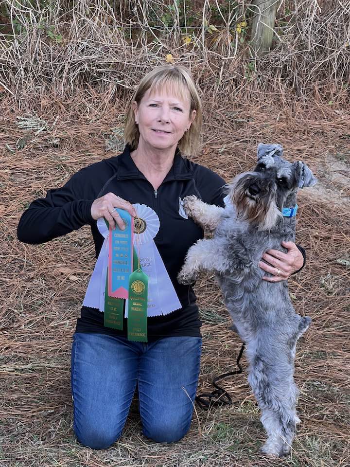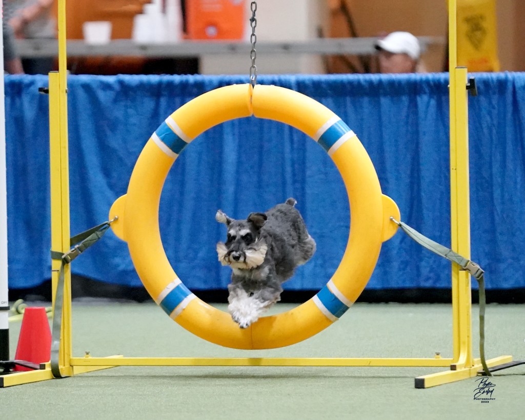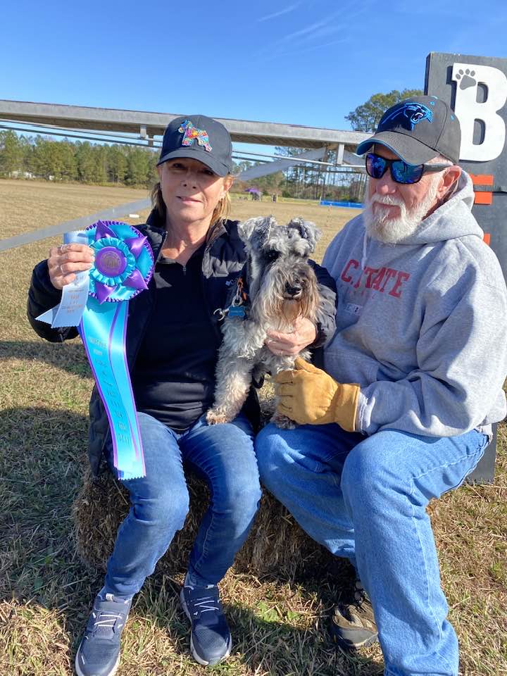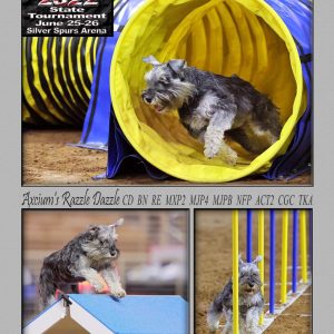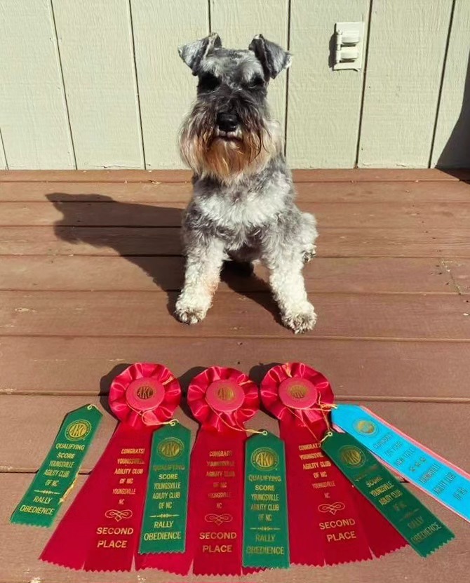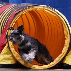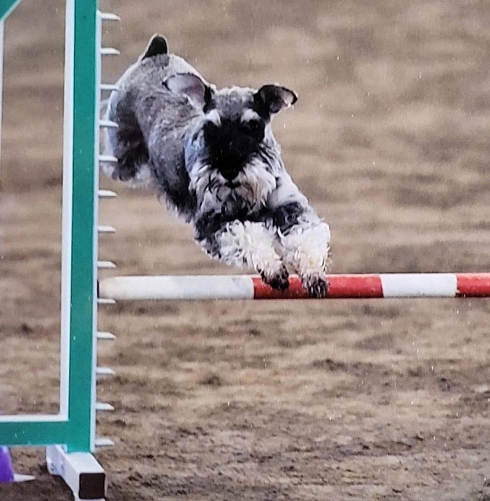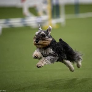 Beauty and Brains: Finney is both a Confirmation Champion and an Agility Champion! He earned his Master Agility Championship (MACH) and then went on to earn 3 Preferred Agility Championships (PACH) titles. Finney started his career as an AKC S.T.A.R. Puppy and a Canine Good Citizen. He went on to earn advanced titles in Obedience and Rally. His true love is Fast CAT and Barn Hunt where he also earned advanced titles. He has the American Miniature Schnauzer Club Versatility award. He finished 16 th at the 2018 AKC National Agility Championships in the 8” preferred class! He qualified for Agility Nationals 4 times in his career. He is by far the most awarded Axcium dog and is the father of Binx! He still barn hunts and runs Fast CAT at almost 13 years of age. He is co-owned and loved by Lisa Miller. Finney trained at Canine Capers Agility in Norcross, GA, Atlanta’s Dogwood Obedience Group (ADOG) in Chamblee, GA, and the Atlanta Obedience Club in Norcross, GA.