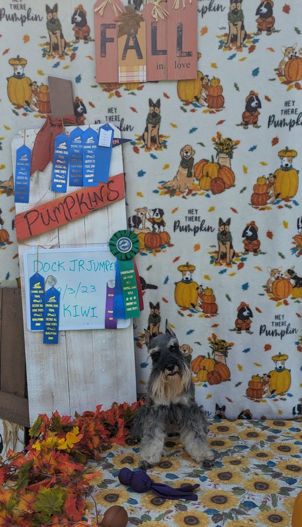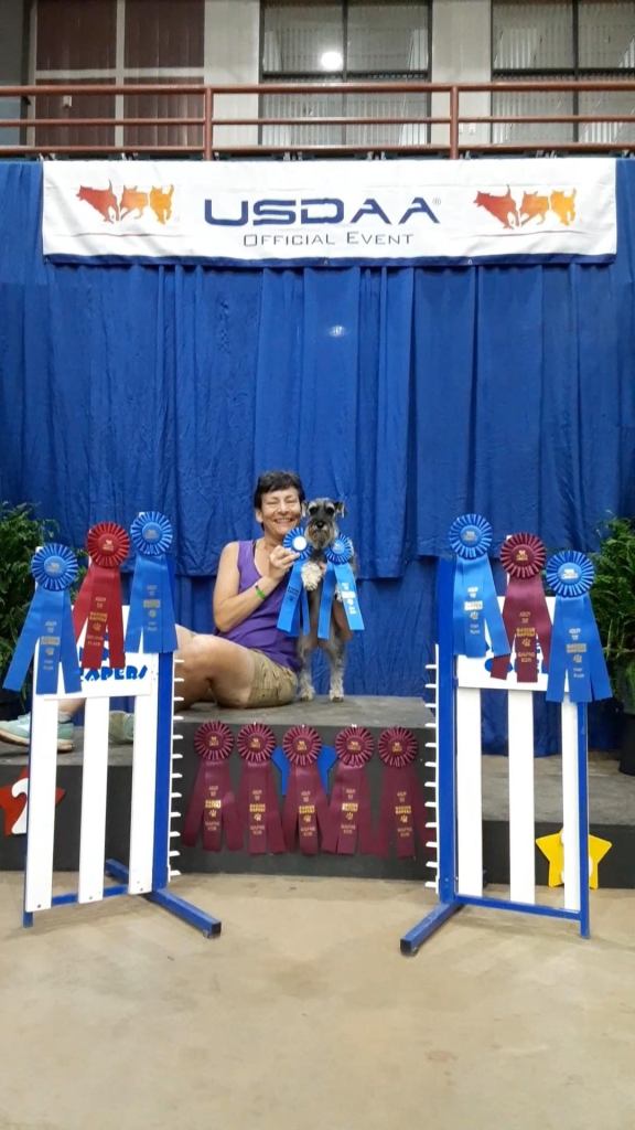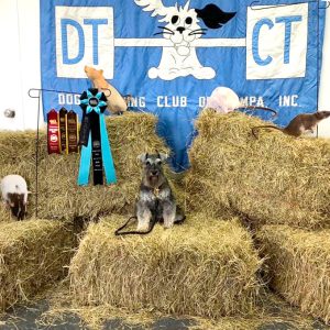Kiwi earned her Canine Good Citizen award and competes in agility, dock diving, and Fast CAT with her owner/trainer/handler Karen Stearns. Kiwi is working towards her MACH title in agility and is also an excellent frisbee dog. Schnauzers are unusual to see in dock diving. They are typically not water lovers! For Kiwi anything involving water is number 1 on her list! Kiwi trains at Radda’s K9 Campus in Talking Rock, GA and The Canine Ranch in Canton, GA.