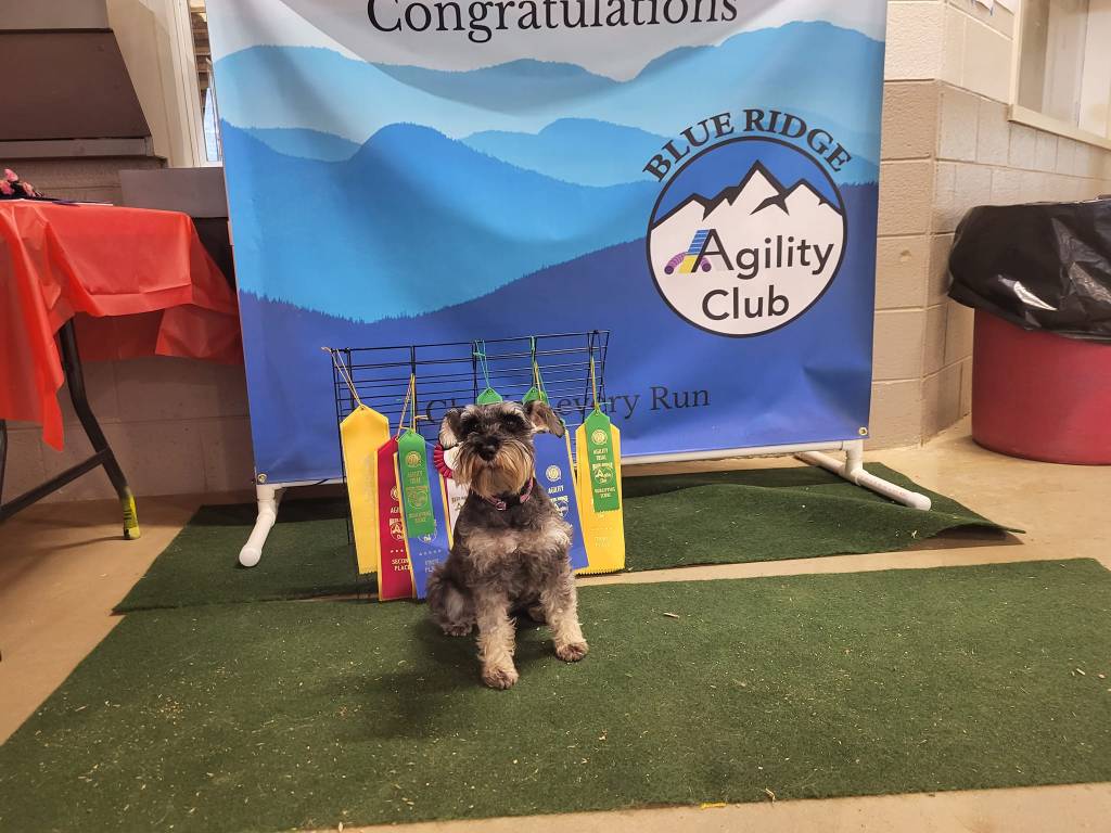 Binx has made us all proud and followed in her daddy Finnegan’s footsteps when she earned her MACH (Master Agility Championship) title. She started her career from the AKC S.T.A.R Puppy class. A COVID puppy, Binx skipped breed competition in favor of dog sports. In addition to agility she excels in barn hunt and Fast CAT and holds advanced titles in both. Binx is loved/trained/handled by her dedicated co-owner Lisa Miller. They qualified for and competed at the 2024 AKC National Agility Championship finishing 17 th in the 12” regular class out of 146 dogs! They train with the Atlanta Obedience Club and Canine Capers Agility in north Atlanta and at The Canine Ranch in Canton, GA.